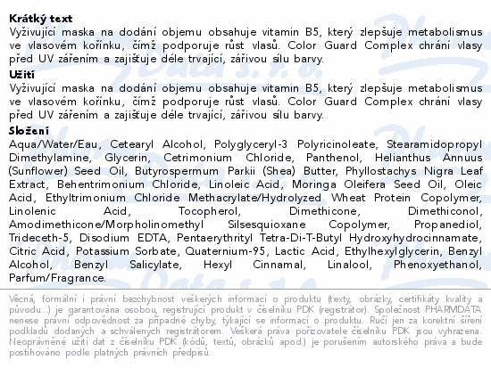 Vyživující maska na dodání objemu obsahuje vitamin B5, který zlepšuje metabolismus ve vlasovém kořínku, čímž podporuje růst vlasů. Color Guard Complex chrání vlasy před UV zářením a zajišťuje déle trvající, zářivou sílu barvy.