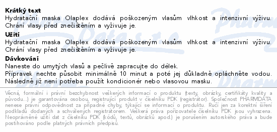 Hydratační maska Olaplex dodává poškozeným vlasům vlhkost a intenzivní výživu. Chrání vlasy před znečištěním a vyživuje je.