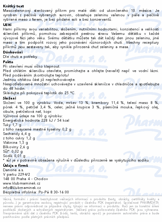 Masozeleninový sterilovaný příkrm pro malé děti od ukončeného 10. měsíce. Je vyroben z pečlivě vybraných surovin, obsahuje zeleninu vařenou v páře a pečlivě vybrané maso z farem, je bez přidané soli a bez konzervantů.