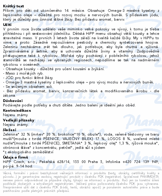 Příkrm pro děti od ukončeného 14. měsíce. Obsahuje: Omega-3 mastné kyseliny z řepkového oleje – důležité pro rozvoj mozku a nervových buněk. S přídavkem jódu, který je důležitý pro činnost štítné žlázy. Bez přídavku aromat, barviv.
