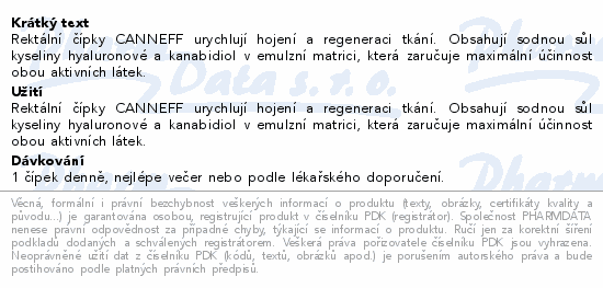 Rektální čípky CANNEFF urychlují hojení a regeneraci tkání. Obsahují sodnou sůl kyseliny hyaluronové a kanabidiol v emulzní matrici, která zaručuje maximální účinnost obou aktivních látek.