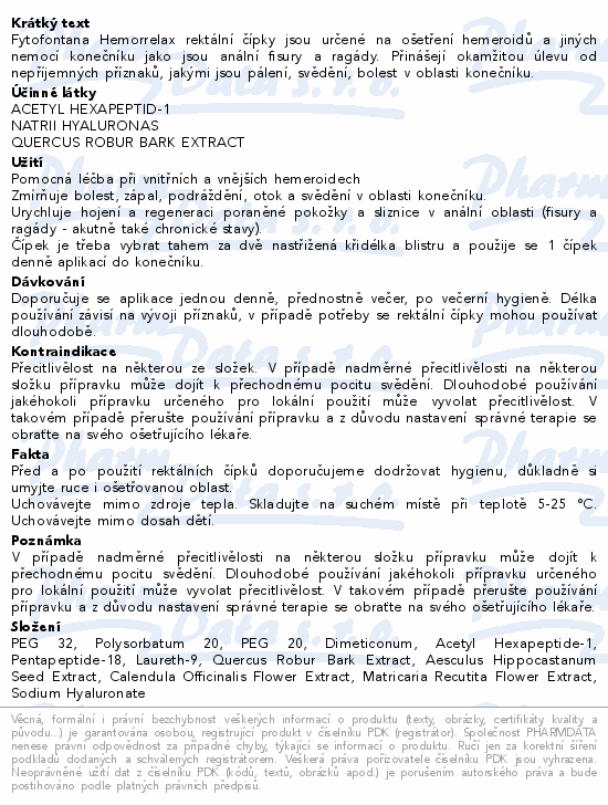 Obsahuje unikátní kombinaci rostlinných složek, biotechnologických peptidů, kyseliny hyaluronové a lubrikační složky, díky kterým má antimikrobiální, antiseptické, stahující, protizánětlivé a anestetické účinky. Hemorrelax čípky pomáhají uvolnit svaly análního svěrače (bezbolestné vyprazdňování stolice), podporují hojení drobných ran v konečníku (anální trhliny a ragády) při akutních i chronických stavech a pomáhají předcházet a snižovat výskyt bakteriálních infekcí.
