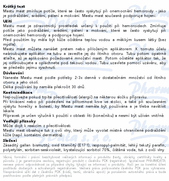 Mastu mast 30 g je léčivý přípravek určený k lokální léčbě hemoroidů a dalších zánětlivých onemocnění v oblasti konečníku. Působí stahujícím, ochranným a protizánětlivým účinkem, a tím zmírňuje příznaky, jako jsou pálení, svědění, bolestivost a podráždění. Mastu mast obsahuje gallan bismutitý a oxid titaničitý - vytvářejí ochranný film na sliznici; působí mírně antisepticky a adstringentně (stahují cévy); tlumí krvácení z drobných poranění a podporují hojení a regeneraci tkání v oblasti konečníku.