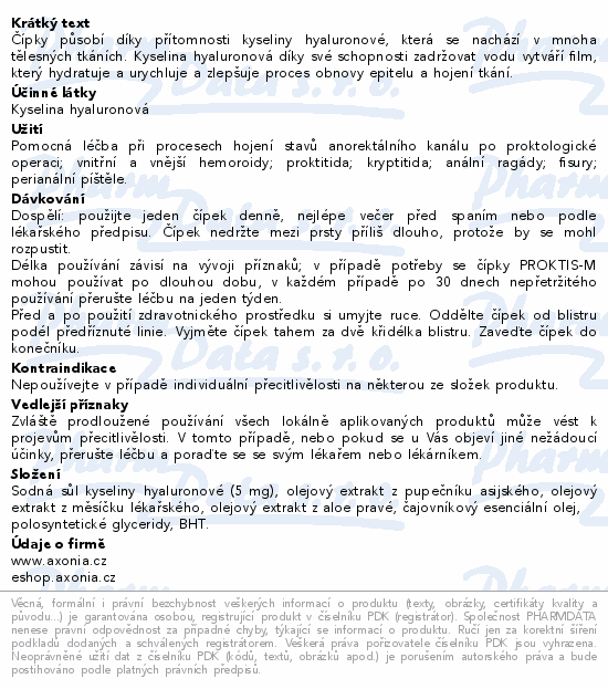 Čípky PROKTIS-M působí díky přítomnosti kyseliny hyaluronové, která přináší tkáním výživu a pružnost. Četné klinické studie prokázaly schopnost kyseliny hyaluronové urychlit a zlepšit proces reepitelizace a obnovy tkání.