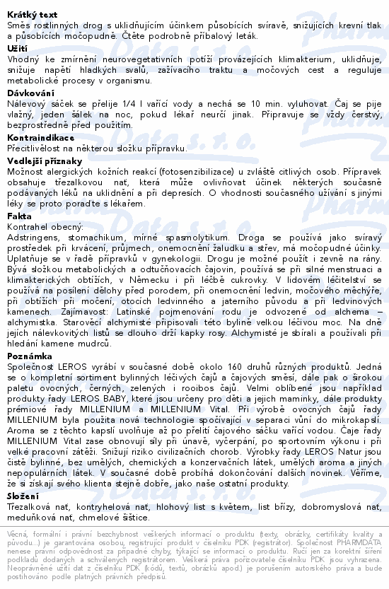 Směs rostlinných drog s uklidňujícím účinkem působících svíravě, snižujících krevní tlak a působících močopudně. Čtěte pozorně příbalový leták.