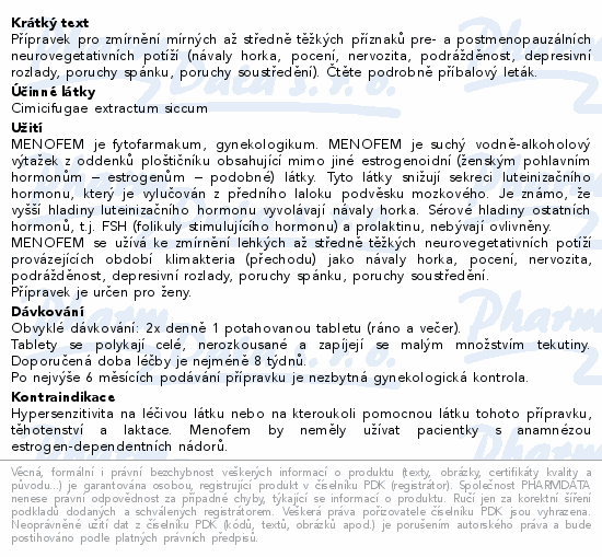 Menofem je registrovaný léčivý přípravek určený k úlevě od mírných až středně závažných příznaků perimenopauzy a menopauzy. Jedná se o ověřený rostlinný přípravek, jehož účinnou látkou je extrakt z byliny ploštičníku hroznatého.