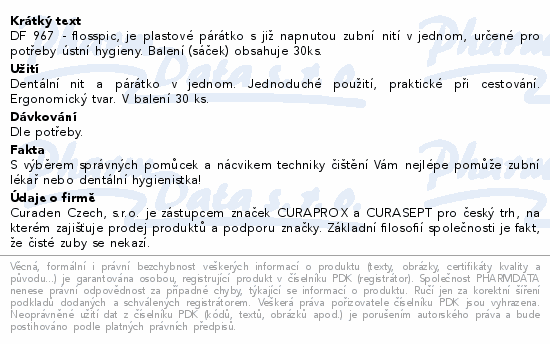 DF 967 - flosspic, je plastové párátko s již napnutou zubní nití v jednom, určené pro potřeby ústní hygieny. Balení (sáček) obsahuje 30ks.