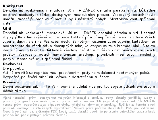 Dentální nit voskovaná, mentolová, 50 m + DÁREK dentální párátka s nití. Důkladně odstraní nečistoty z těžko dostupných mezizubních prostor. Voskovaný povrch navíc umožní snadnější proniknutí mezi zuby i následný pohyb. Mentolová chuť zpříjemní čištění.
