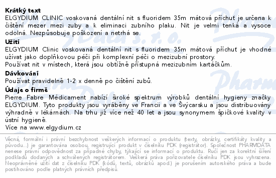 ELGYDIUM CLINIC voskovaná dentální nit s fluoridem 35m mátová příchuť je určena k čištění mezer mezi zuby a k eliminaci zubního plaku. Nit je velmi tenká a vysoce odolná. Nezpůsobuje poškození a netrhá se.