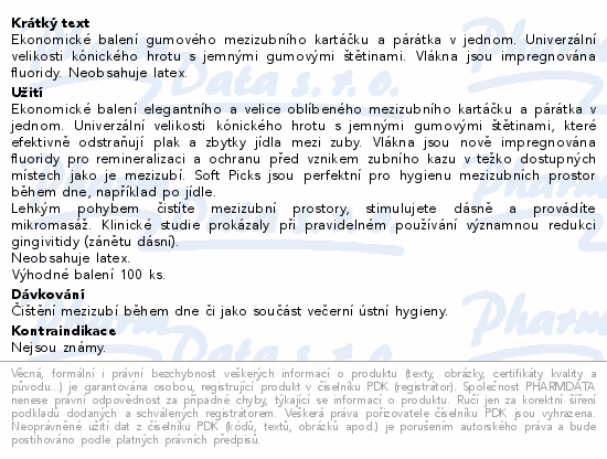 Ekonomické balení gumového mezizubního kartáčku a párátka v jednom. Univerzální velikosti kónického hrotu s jemnými gumovými štětinami. Vlákna jsou impregnována fluoridy. Neobsahuje latex.