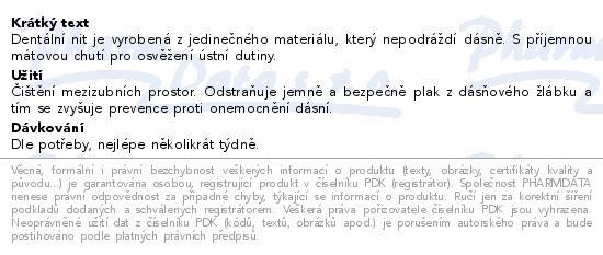 Dentální nit je vyrobená z jedinečného materiálu, který nepodráždí dásně. S příjemnou mátovou chutí pro osvěžení ústní dutiny.