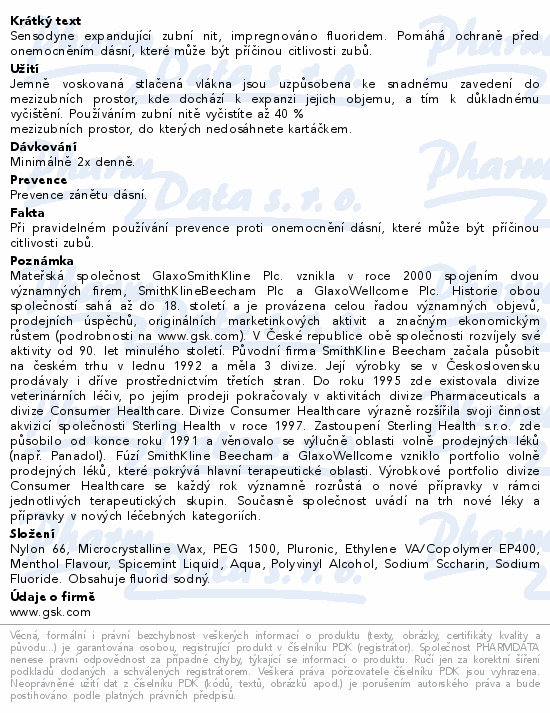 Sensodyne expandující zubní nit, impregnováno fluoridem. Pomáhá ochraně před onemocněním dásní, které může být příčinou citlivosti zubů.
