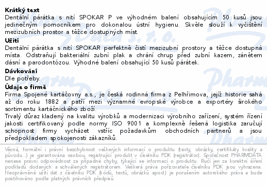 Dentální párátka s nití SPOKAR P ve výhodném balení obsahujícím 50 kusů jsou jedinečným pomocníkem pro dokonalou ústní hygienu. Skvěle slouží k vyčištění mezizubních prostor a těžce dostupných míst.