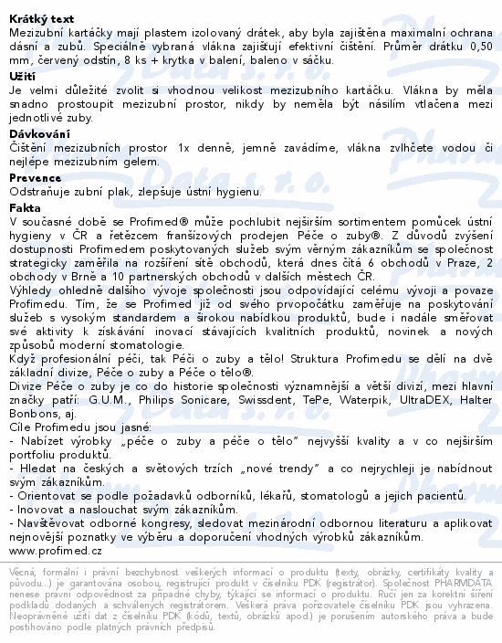 Mezizubní kartáčky mají plastem izolovaný drátek, aby byla zajištěna maximalní ochrana dásní a zubů. Speciálně vybraná vlákna zajišťují efektivní čištění. Průměr drátku 0,50 mm, červený odstín, 8 ks + krytka v balení, baleno v sáčku.