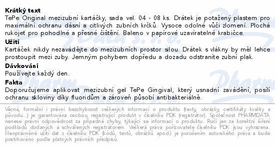 TePe Original mezizubní kartáčky, sada vel. 04 - 08 ks. Drátek je potažený plastem pro maximální ochranu dásní a citlivých zubních krčků. Vysoce odolné vůči zlomení. Plochá rukojeť pro pohodlné a přesné čištění. Baleno v papírové uzavíratelné krabičce.