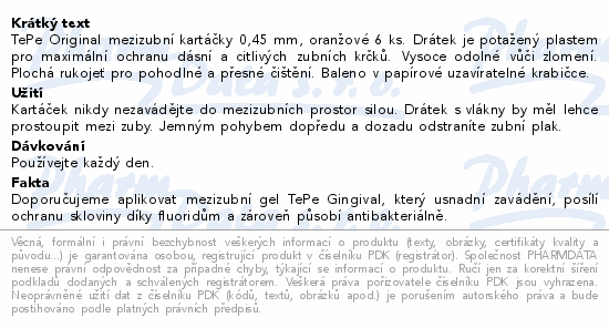 TePe Original mezizubní kartáčky 0,45 mm, oranžové 6 ks. Drátek je potažený plastem pro maximální ochranu dásní a citlivých zubních krčků. Vysoce odolné vůči zlomení. Plochá rukojeť pro pohodlné a přesné čištění. Baleno v papírové uzavíratelné krabičce.
