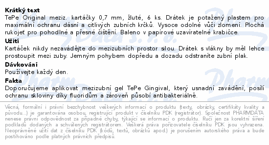 TePe Original meziz. kartáčky 0,7 mm, žluté, 6 ks. Drátek je potažený plastem pro maximální ochranu dásní a citlivých zubních krčků. Vysoce odolné vůči zlomení. Plochá rukojeť pro pohodlné a přesné čištění. Baleno v papírové uzavíratelné krabičce.