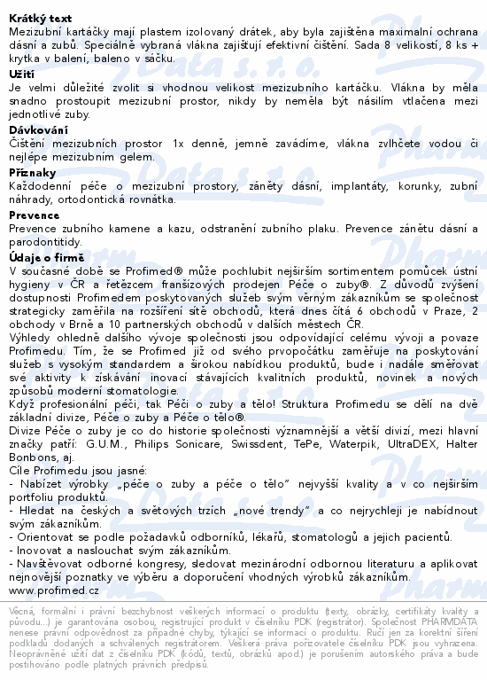 Mezizubní kartáčky mají plastem izolovaný drátek, aby byla zajištěna maximalní ochrana dásní a zubů. Speciálně vybraná vlákna zajišťují efektivní čištění. Sada 8 velikostí, 8 ks + krytka v balení, baleno v sáčku.