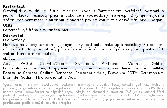 Osvěžující a zklidňující čisticí micelární voda s Panthenolem perfektně odstraní v jednom kroku nečistoty pleti a dokonce i voděodolný make-up. Díky zjemňujícímu složení bez parfemace a alkoholu je vhodná pro citlivou pleť a citlivé oční okolí. Vegan.