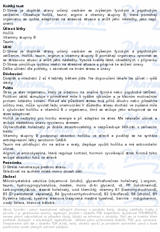 D-Stress je doplněk stravy určený osobám se zvýšeným fyzickým a psychickým zatížením. Obsahuje hořčík, taurin, arginin a vitamíny skupiny B, které pomáhají organismu se rychle adaptovat na stresové situace a snížit jeho následky, jako např. únavu.