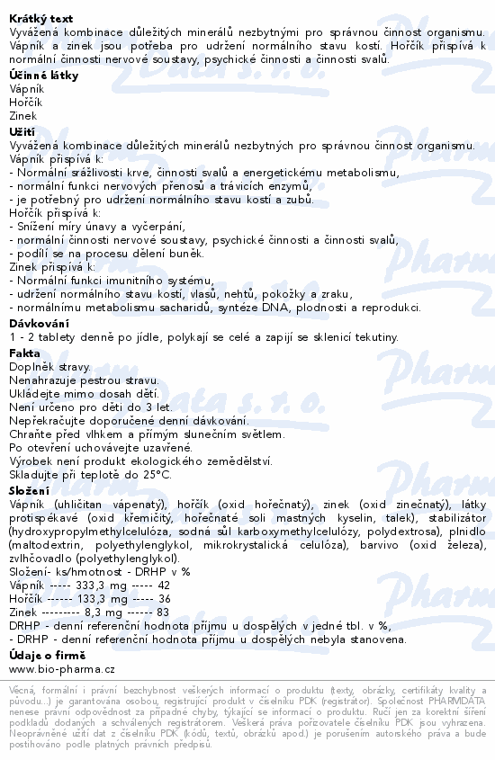 Vyvážená kombinace důležitých minerálů nezbytnými pro správnou činnost organismu. Vápník a zinek jsou potřeba pro udržení normálního stavu kostí. Hořčík přispívá k normální činnosti nervové soustavy, psychické činnosti a činnosti svalů.