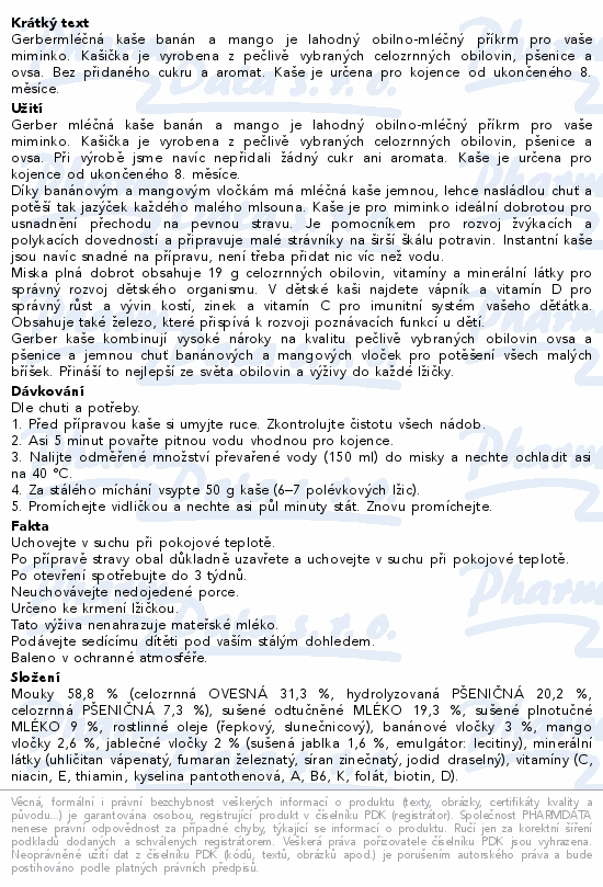 Gerbermléčná kaše banán a mango je lahodný obilno-mléčný příkrm pro vaše miminko. Kašička je vyrobena z pečlivě vybraných celozrnných obilovin, pšenice a ovsa. Bez přidaného cukru a aromat. Kaše je určena pro kojence od ukončeného 8. měsíce.