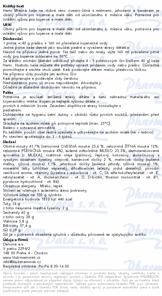 Hami Mléčná kaše na dobré ráno ovesno-žitná s malinami, jahodami a banánem je obilný příkrm pro kojence a malé děti od ukončeného 6. měsíce věku. Potravina pro zvláštní výživu pro kojence a malé děti.