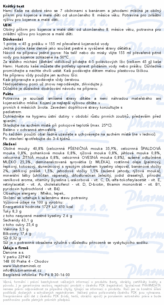 Hami Kaše na dobré ráno se 7 obilninami s banánem a jahodami mléčná je obilný příkrm pro kojence a malé děti od ukončeného 8. měsíce věku. Potravina pro zvláštní výživu pro kojence a malé děti.