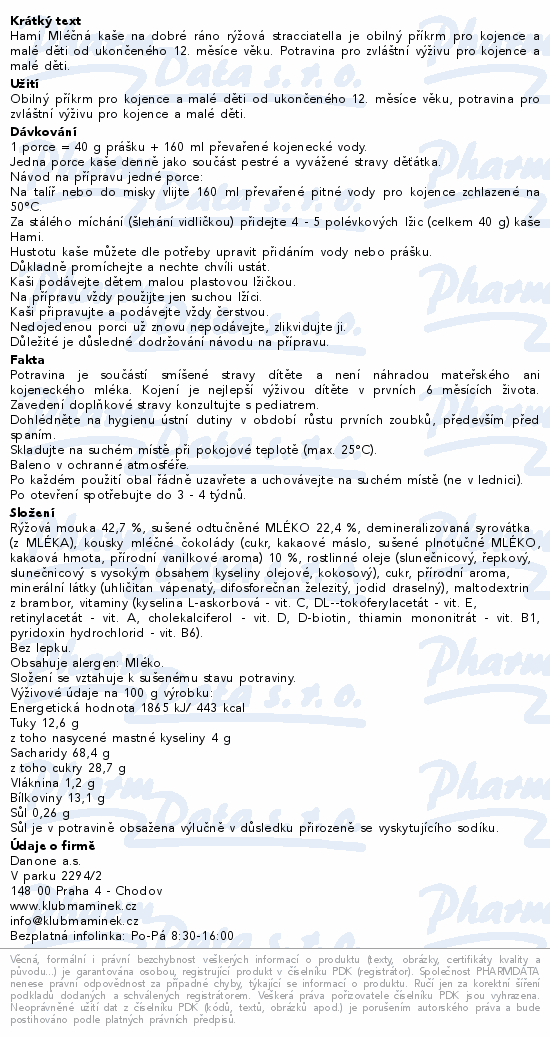 Hami Mléčná kaše na dobré ráno rýžová stracciatella je obilný příkrm pro kojence a malé děti od ukončeného 12. měsíce věku. Potravina pro zvláštní výživu pro kojence a malé děti.