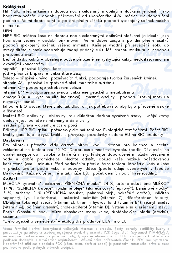 HiPP BIO mléčná kaše na dobrou noc s celozrnnými obilnými vločkami je ideální jako hodnotná večeře v období přikrmování od ukončeného 4./6. měsíce dle doporučení pediatra. Velmi dobře zasytí a po dni plném zážitků podpoří spokojený spánek vašeho miminka.