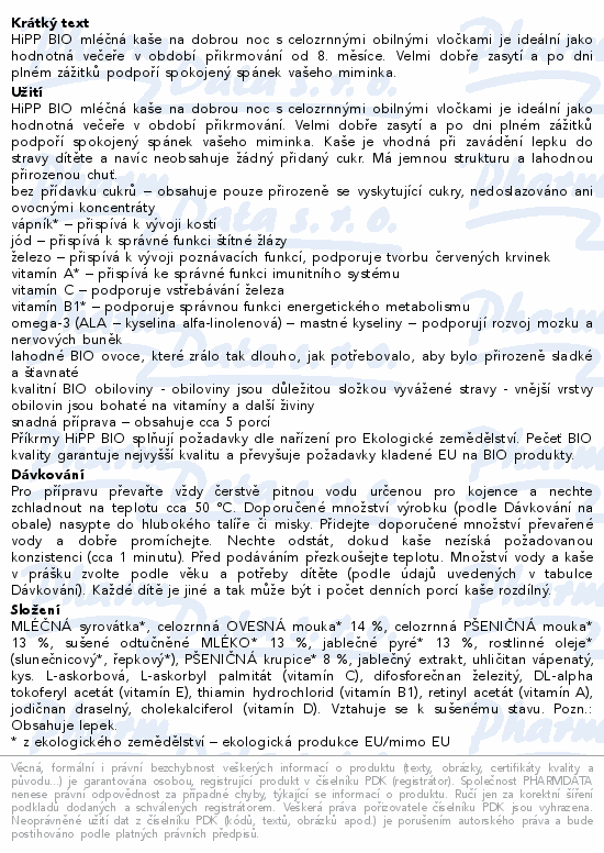 HiPP BIO mléčná kaše na dobrou noc s celozrnnými obilnými vločkami je ideální jako hodnotná večeře v období přikrmování od 8. měsíce. Velmi dobře zasytí a po dni plném zážitků podpoří spokojený spánek vašeho miminka.