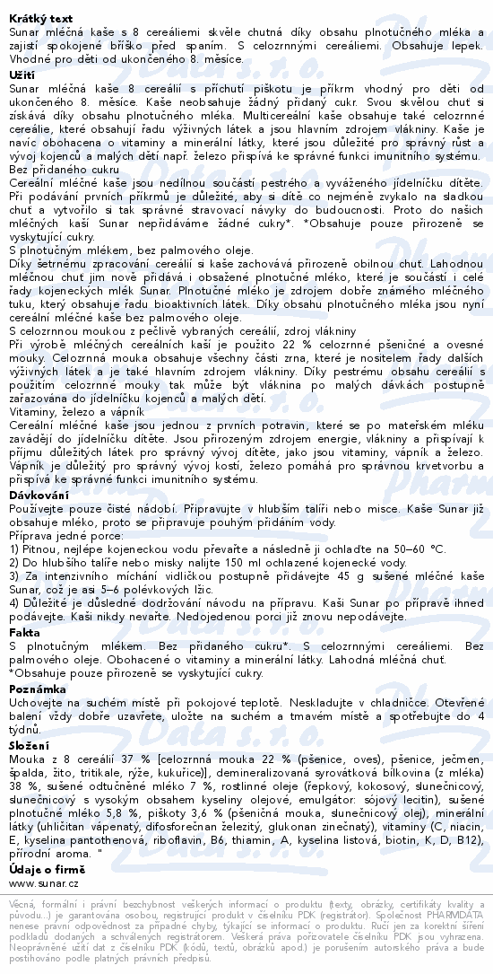 Sunar mléčná kaše s 8 cereáliemi skvěle chutná díky obsahu plnotučného mléka a zajistí spokojené bříško před spaním. S celozrnnými cereáliemi. Obsahuje lepek. Vhodné pro děti od ukončeného 8. měsíce.