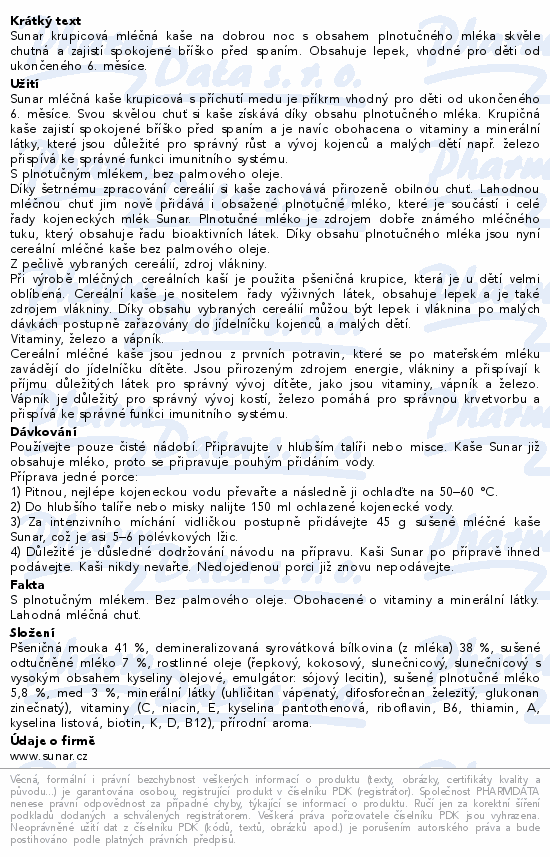 Sunar krupicová mléčná kaše na dobrou noc s obsahem plnotučného mléka skvěle chutná a zajistí spokojené bříško před spaním. Obsahuje lepek, vhodné pro děti od ukončeného 6. měsíce.
