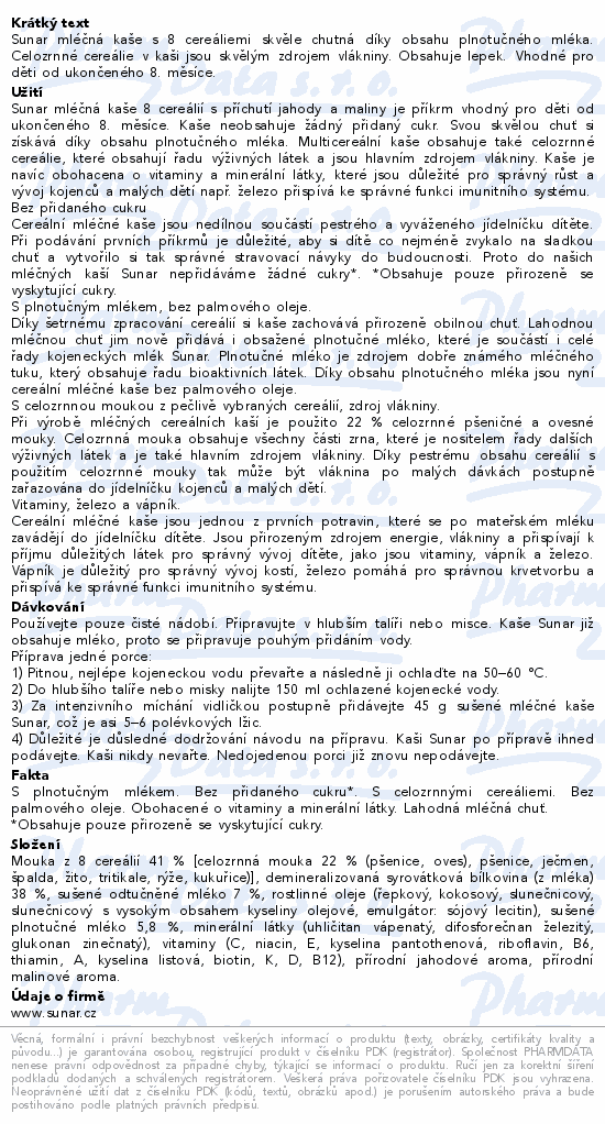 Sunar mléčná kaše s 8 cereáliemi skvěle chutná díky obsahu plnotučného mléka. Celozrnné cereálie v kaši jsou skvělým zdrojem vlákniny. Obsahuje lepek. Vhodné pro děti od ukončeného 8. měsíce.