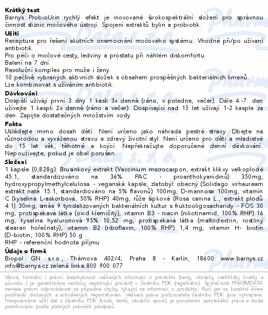 Barnys ProbioUrin rychlý efekt je inovované širokospektrální složení pro správnou činnost sliznic močového ústrojí. Spojení extraktů bylin a probiotik.