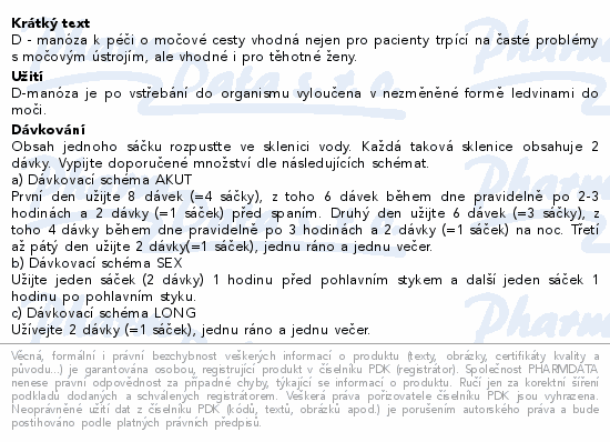 D-manóza se z trávicího traktu vstřebává do krve a následně se vylučuje ledvinami do moči, kde pokryje sliznici močových cest a močového měchýře, a tím zabrání ulpění nežádoucích bakterií. Ty jsou pak jednoduše vyplaveny s proudem moči ven z těla dříve, než stačí způsobit infekci nebo se rozmnožit.