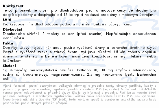 D-manóza se z trávicího traktu vstřebává do krve a následně se vylučuje ledvinami do moči, kde pokryje sliznici močových cest a močového měchýře, a tím zabrání ulpění nežádoucích bakterií. Ty jsou pak jednoduše vyplaveny s proudem moči ven z těla dříve, než stačí způsobit infekci nebo se rozmnožit. Artyčok pak přispívá k normální funkci močových cest a ledvin.