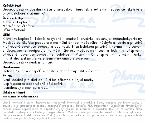 Urosept pastilky obsahují šťávu z kanadských brusinek a extrakty medvědice lékařské a břízy bělokoré a vitamin C.