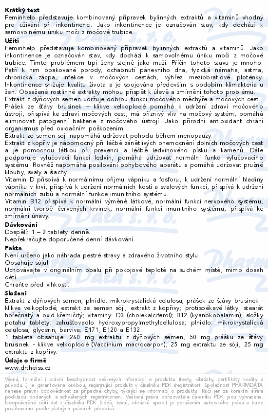 Feminhelp představuje kombinovaný přípravek bylinných extraktů a vitaminů vhodný pro užívání při inkontinenci. Jako inkontinence je označován stav, kdy dochází k samovolnému úniku moči z močové trubice.