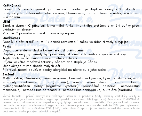 Flonivin D-manóza, prášek pro perorální podání je doplněk stravy s 3 miliardami prospěšných bakterií mléčného kvašení, D-manózou, plodem bezu černého, vitaminem C a zinkem.