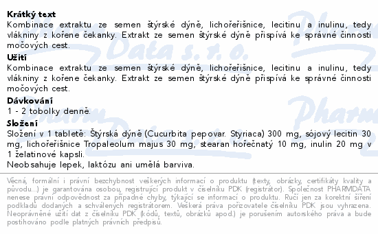 Kombinace extraktu ze semen štýrské dýně, lichořeřišnice, lecitinu a inulinu, tedy vlákniny z kořene čekanky. Extrakt ze semen štýrské dýně přispívá ke správné činnosti močových cest.