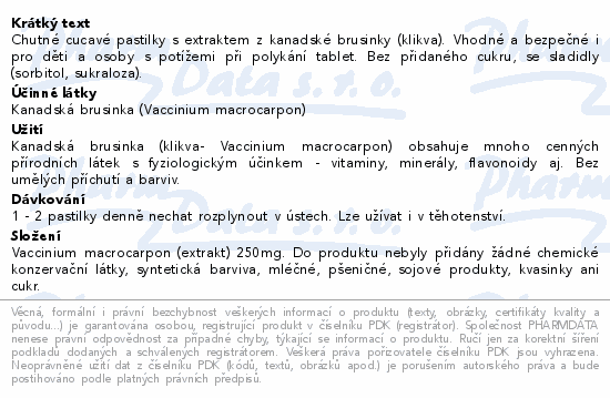 Chutné cucavé pastilky s extraktem z kanadské brusinky (klikva). Vhodné a bezpečné i pro děti a osoby s potížemi při polykání tablet. Bez přidaného cukru, se sladidly (sorbitol, sukraloza).