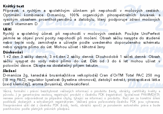 UroPerfect Manóza RAPID je přípravek s rychlým a spolehlivým účinkem při nepohodlí v močových cestách. Optimální kombinace D-manózy, koncentrovaného brusinkového extraktu a zlatobýlu, který podporuje zdraví močových cest a měchýře. S vitaminem D.