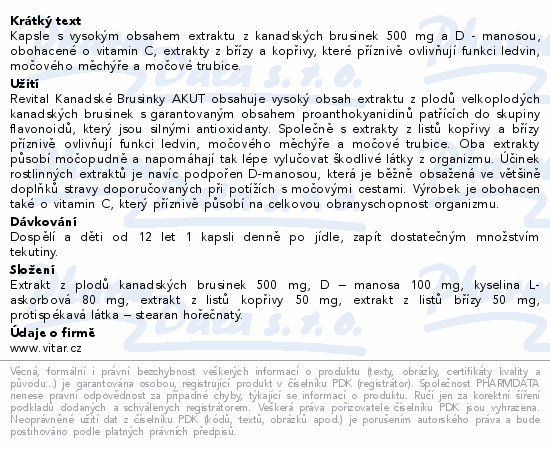 Kapsle s vysokým obsahem extraktu z kanadských brusinek 500 mg a D - manosou, obohacené o vitamin C, extrakty z břízy a kopřivy, které příznivě ovlivňují funkci ledvin, močového měchýře a močové trubice.
