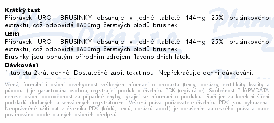 Přípravek URO –BRUSINKY obsahuje v jedné tabletě 144mg 25% brusinkového extraktu, což odpovídá 8600mg čerstvých plodů brusinek.