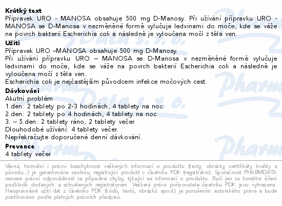 Přípravek URO - MANOSA obsahuje 500 mg D-Manosy. Při užívání přípravku URO - MANOSA se D-Manosa v nezměněné formě vylučuje ledvinami do moče, kde se váže na povrch bakterií Escherichia coli a následně je vyloučena močí z těla ven.