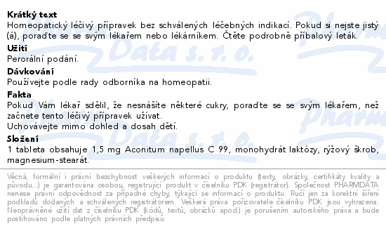 1 tableta obsahuje 1,5 mg Aconitum napellus 99 C, monohydrát laktózy, rýžový škrob, magnesium-stearát. Čtěte pozorně příbalový leták.