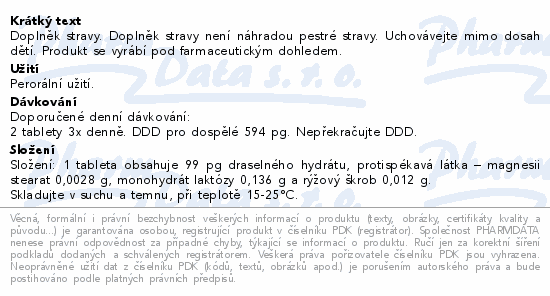 Produkt se vyrábí pod farmaceutickým dohledem. Složení: 1 tableta obsahuje 99 pg draselného hydrátu, protispékavá látka - magnesii stearat 0,0028 g, monohydrát laktózy 0,136 g a rýžový škrob 0,012 g – součást tablety.
