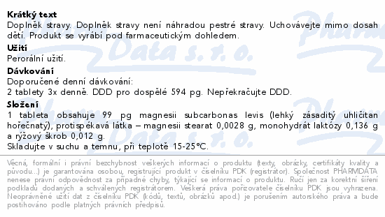 Produkt se vyrábí pod farmaceutickým dohledem. Složení: 1 tableta obsahuje 99 pg Magnesii subcarbonas levis (lehký zásaditý uhličitan hořečnatý), protispékavá látka - magnesii stearat 0,0028 g, monohydrát laktózy 0,136 g a rýžový škrob 0,012 g.