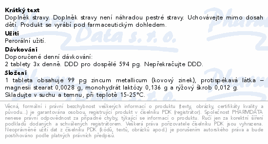 Produkt se vyrábí pod farmaceutickým dohledem. Složení: 1 tableta obsahuje 99 pg Zincum metallicum (kovový zinek), protispékavá látka - magnesii stearat 0,0028 g, monohydrát laktózy 0,136 g a rýžový škrob 0,012 g – součást tablety.